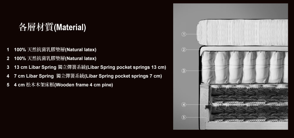 100%天然抗菌乳膠墊層,有良好的散熱功能,透氣性效果好。柔軟的彈性效果,能緊密支撐人體自然曲線。